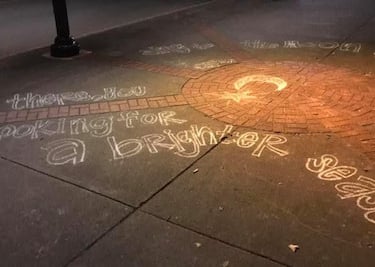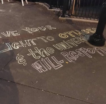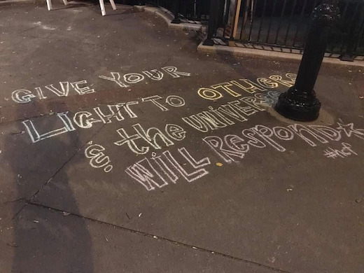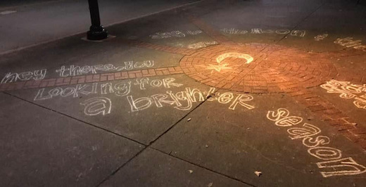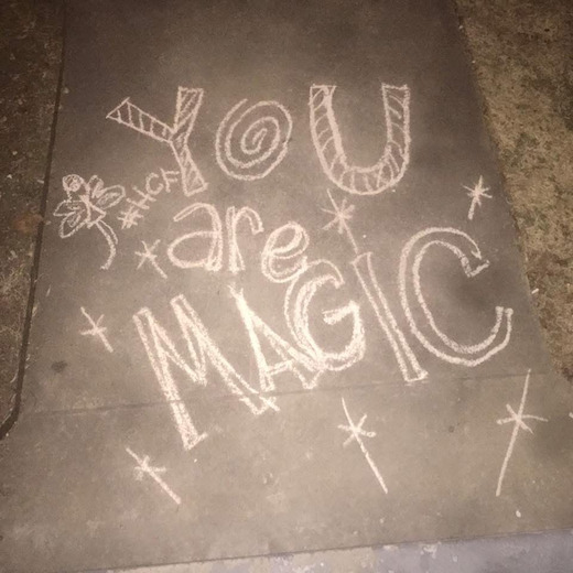 The example of her handiwork we ran on the cover the 2017 Holiday Issue (Hillcrest Newsletter) was typical of what the HCF put down. Handwritten in hot pink chalk, it reminds the reader that “It only takes a moment to make a stranger smile. #HCF.” What’s not to love about that?